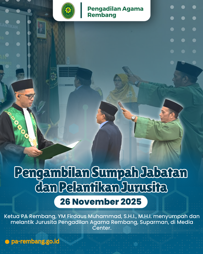 Rembang, 26 November 2025 — Pengadilan Agama (PA) Rembang menyelenggarakan Pengambilan Sumpah Jabatan dan Pelantikan Jurusita pada Rabu (26/11), bertempat di Ruang Media Center PA Rembang. Dalam prosesi yang berlangsung khidmat tersebut, Ketua PA Rembang, Firdaus Muhammad, S.H.I., M.H.I. secara resmi mengambil sumpah dan melantik Suparman sebagai Jurusita PA Rembang.