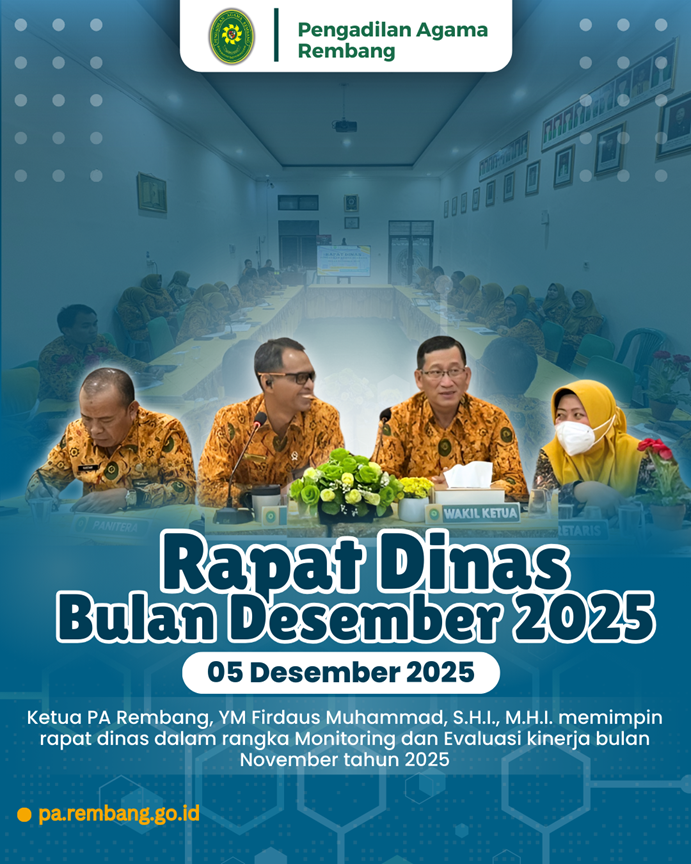 Rembang, 05 Desember 2025 — Pengadilan Agama (PA) Rembang kembali menggelar rapat dinas bulanan yang berlangsung di Media Center PA Rembang, pada Jumat (05/12). Rapat ini dipimpin oleh Ketua PA Rembang, Firdaus Muhammad, S.H.I., M.H.I., dan dihadiri oleh seluruh aparatur PA Rembang.