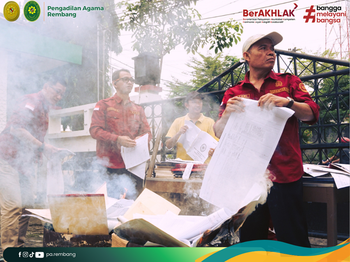 Selanjutnya, pelaksanaan pemusnahan BMN dilakukan secara tertib dengan memperhatikan prinsip transparansi dan akuntabilitas, serta disaksikan oleh pejabat yang berwenang. Seluruh proses didokumentasikan dengan baik sebagai bentuk pertanggungjawaban administrasi dan penguatan pengelolaan aset negara. Melalui kegiatan ini, Pengadilan Agama Rembang menegaskan komitmennya dalam mewujudkan pengelolaan BMN yang profesional, efisien, dan sesuai dengan prinsip tata kelola pemerintahan yang baik (good governance).