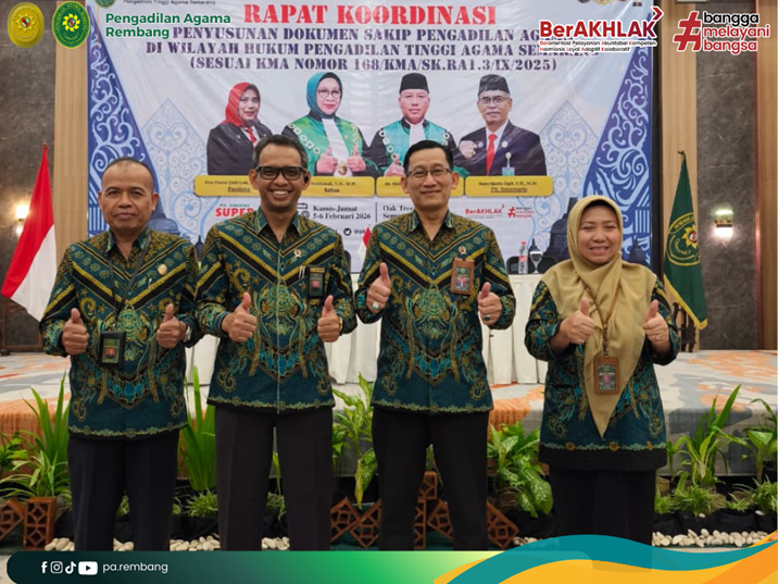 SEMARANG – Dalam upaya meningkatkan kualitas tata kelola instansi dan mempertebal nilai spiritualitas aparatur, jajaran pimpinan Pengadilan Agama (PA) Rembang menghadiri rangkaian kegiatan penting yang diselenggarakan oleh Pengadilan Tinggi Agama (PTA) Semarang. Delegasi PA Rembang yang terdiri dari Ketua, Wakil Ketua, Panitera, dan Sekretaris mengikuti kegiatan yang berlangsung selama dua hari, yakni Kamis s.d. Jumat, 5-6 Februari 2026. Kegiatan ini merupakan agenda strategis yang memadukan Rapat Koordinasi (Rakor) penyusunan dokumen SAKIP (Sistem Akuntabilitas Kinerja Instansi Pemerintah) dengan peringatan hari besar keagamaan Isra Mikraj Nabi Muhammad SAW.