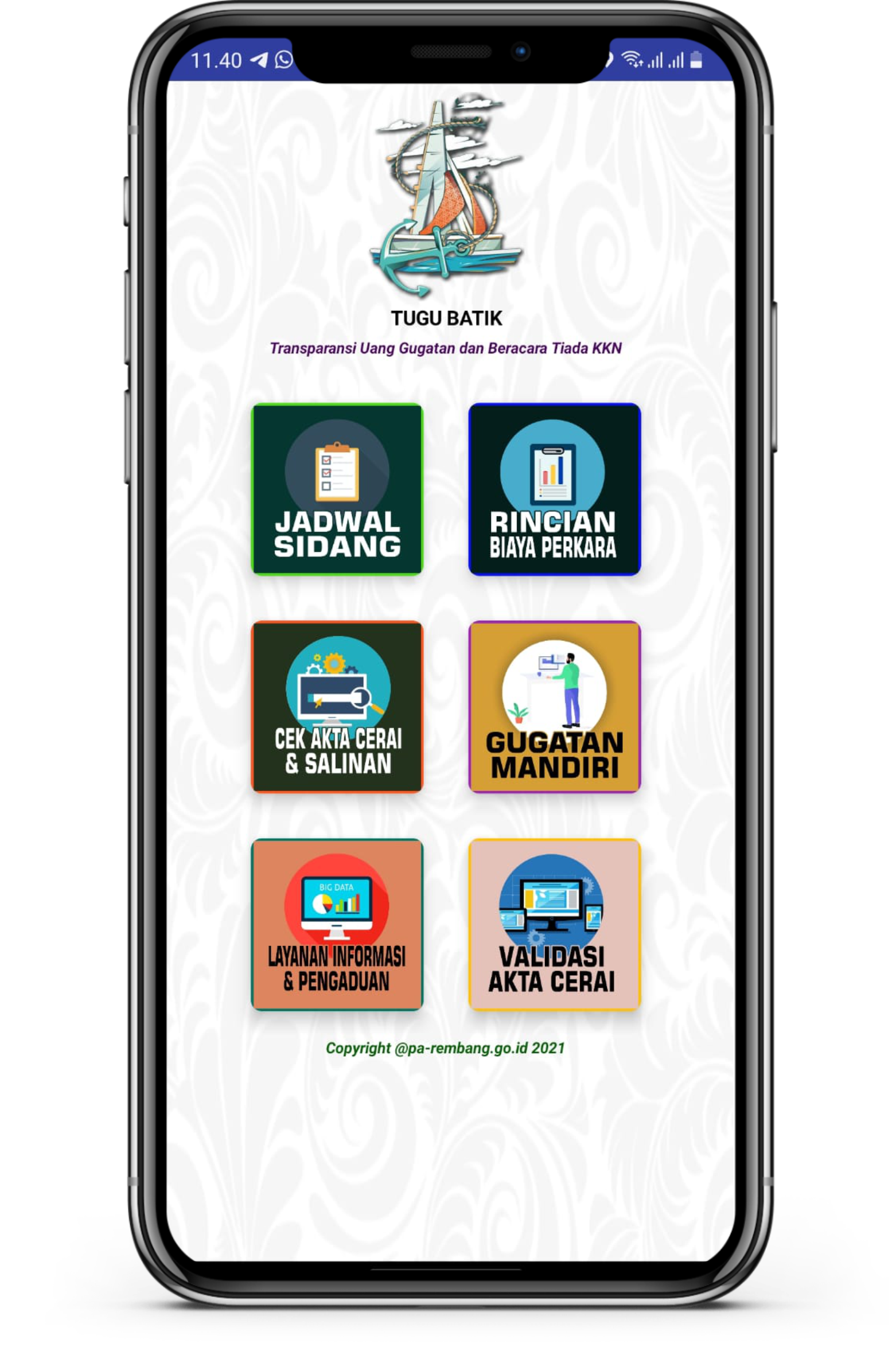 Tugu Batik adalah Transparansi Uang Gugatan dan Beracara Tiada KKN. Tugu Batik merupakan Aplikasi yang dikembangkan oleh Pengadilan Agama Rembang untuk meningkatkan kualitas pelayan publik yang prima. didalam aplikasi tersebut terdapat menu diantaranya :